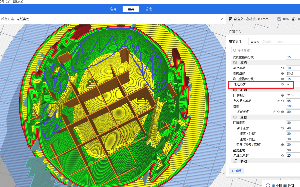 此功能可實現只在模型頂部需要支撐的區域產生填充,相比無填充,保證了模型頂部不會掉落,并較大幅度減少了打印時間和用料。