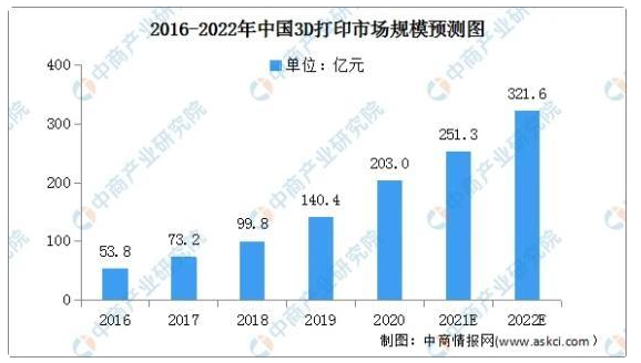 隨著政策的支持及企業(yè)的創(chuàng)新突破,我國3D打印產(chǎn)業(yè)有望獲得持續(xù)發(fā)展。據(jù)中商產(chǎn)業(yè)研究院預(yù)測,2022年我國3D打印市場規(guī)模有望增長至321.6億元。