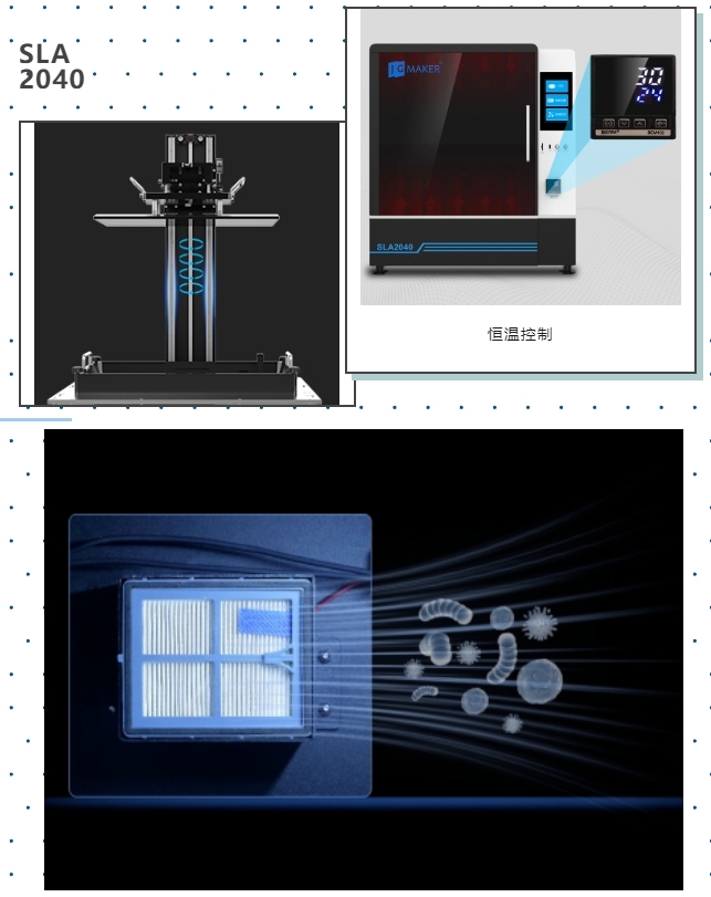 伺服電機控制系統搭配的精密滾珠絲桿,有效降低打印過程中產生的噪音,真正實現靜音打印。同時,SLA 2040還內置了多層空氣過濾網,有效凈化打印環境和料池樹脂異味,讓打印環境更舒適干凈!