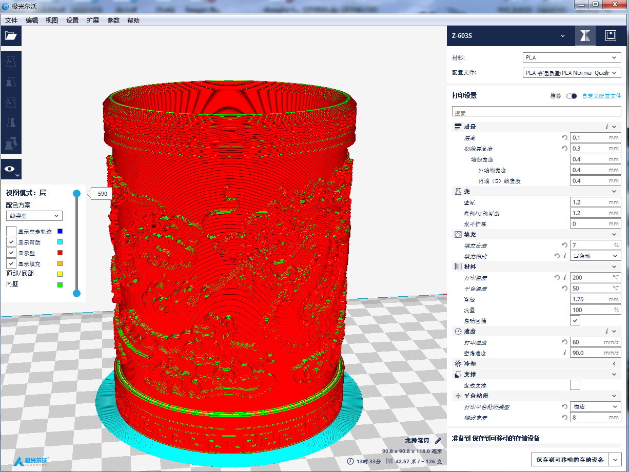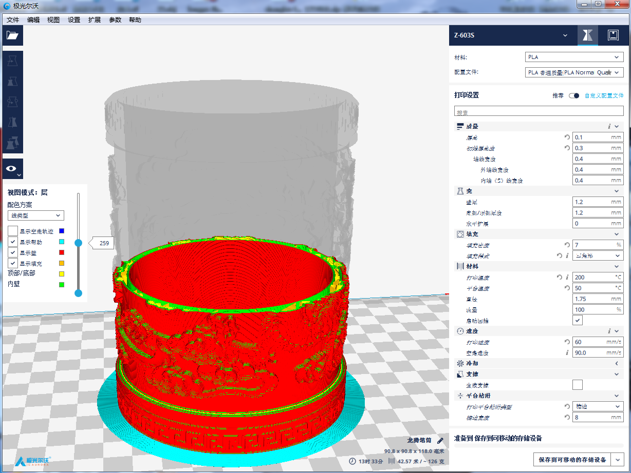 拖動(dòng)分層預(yù)覽滾動(dòng)條,軟件可以根據(jù)參數(shù)值,展現(xiàn)每一層的圖像。我們知道FDM打印技術(shù)原理,其實(shí)就是通過(guò)一層一層的材料堆積來(lái)實(shí)現(xiàn)整個(gè)模型的成型。通過(guò)預(yù)覽,你可以直觀(guān)地觀(guān)察到模型是怎樣一層一層生成的。