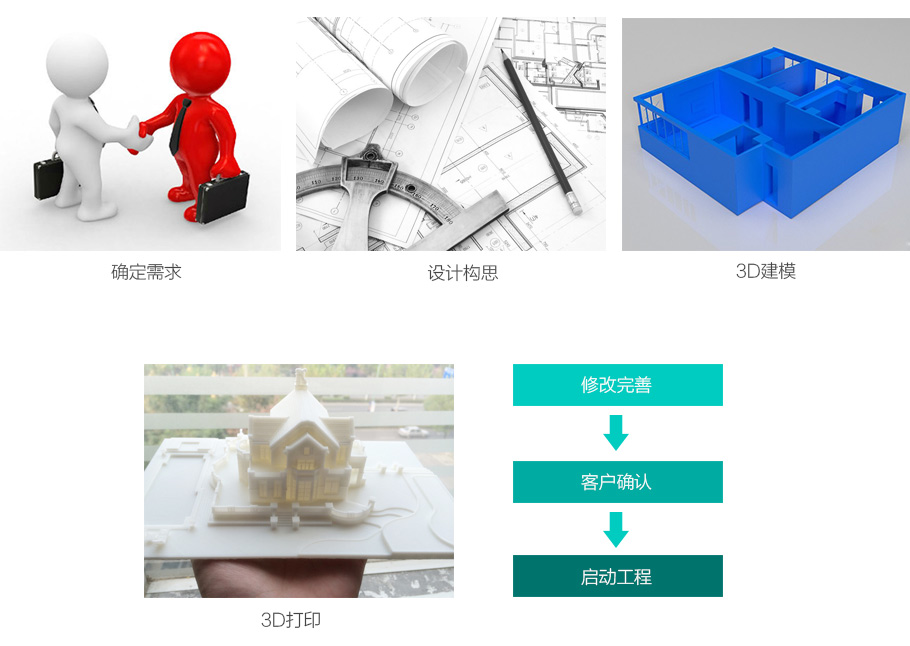 了解客戶需求→構思設計→3D建模→3D打印出來→修改完善→客戶確認→啟動工程。